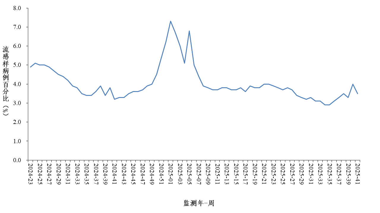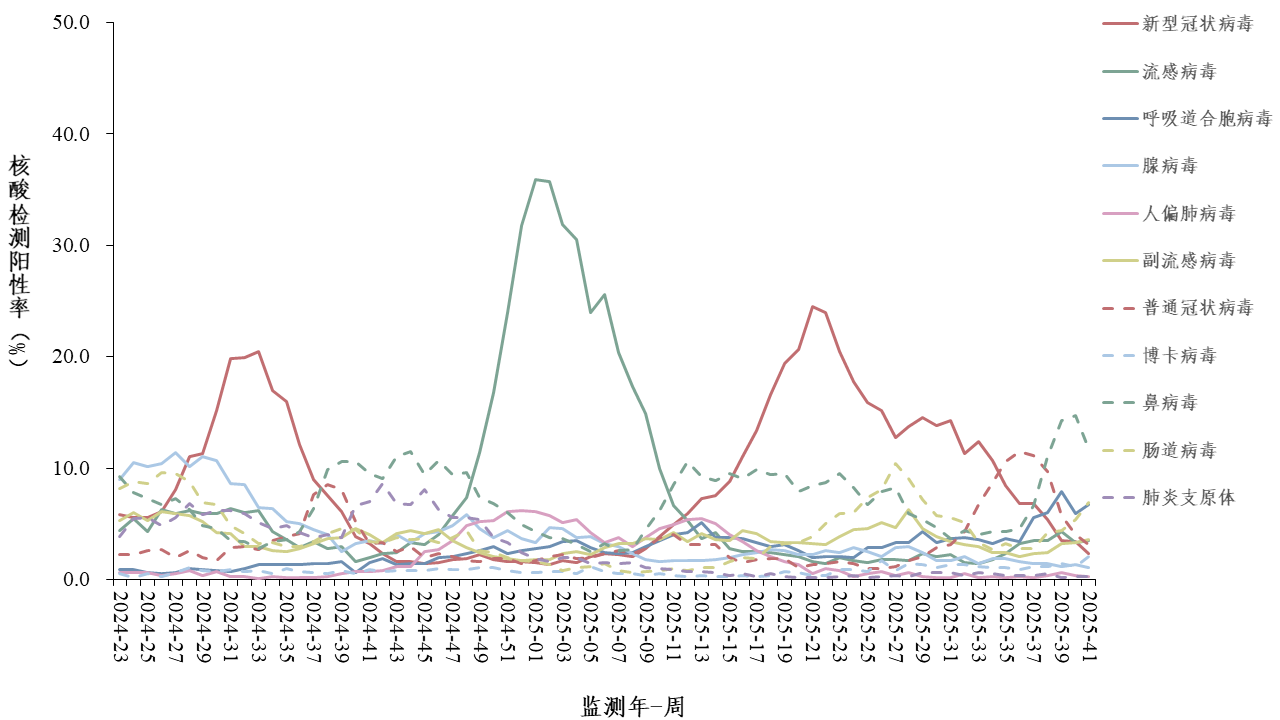 2025年第41周(2025年10月6日—10月12日),对全国哨点医院(不含港澳台)采集的门急诊流感样病例和住院严重急性呼吸道感染病例的呼吸道样本,开展新型冠状病毒、流感病毒、呼吸道合胞病毒、腺病毒、人偏肺病毒、副流感病毒、普通冠状病毒、博卡病毒、鼻病毒和肠道病毒等10种病毒以及肺炎支原体在内的多种呼吸道病原体检测。