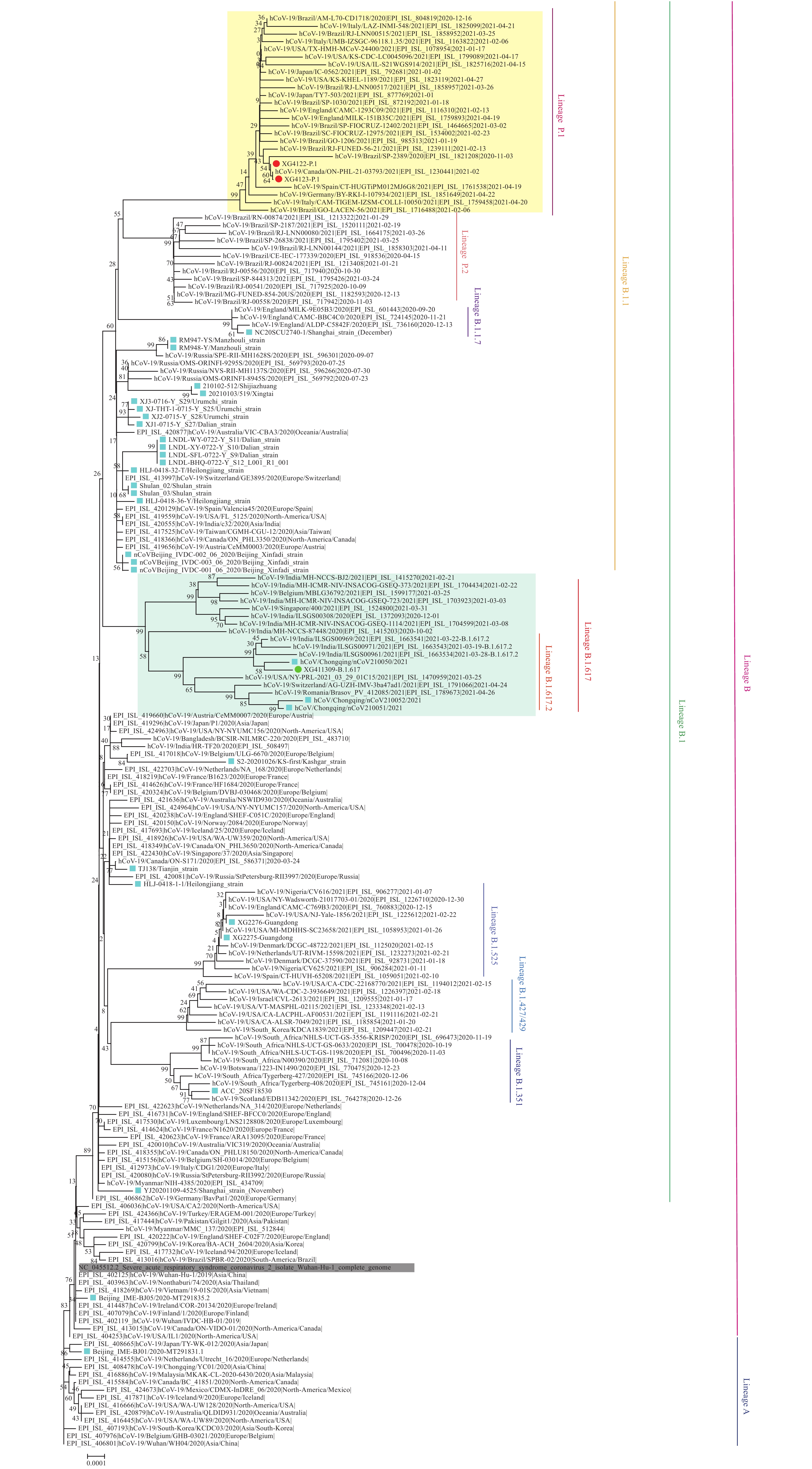 Figure 1.Phylogenetic tree based on the full-length genome sequences of the COVID-19 virus. The Brazil variants (P.1) are highlighted in yellow and the Guangdong imported P.1 variants are marked with red dots. The strains associated with specific outbreaks in China are marked with blue squares. The Wuhan reference strain is shaded in gray. The seven distinguished COVID-19 mutants are marked and colored on the right. The A or B lineage of the COVID-19 virus were marked and colored on the right.