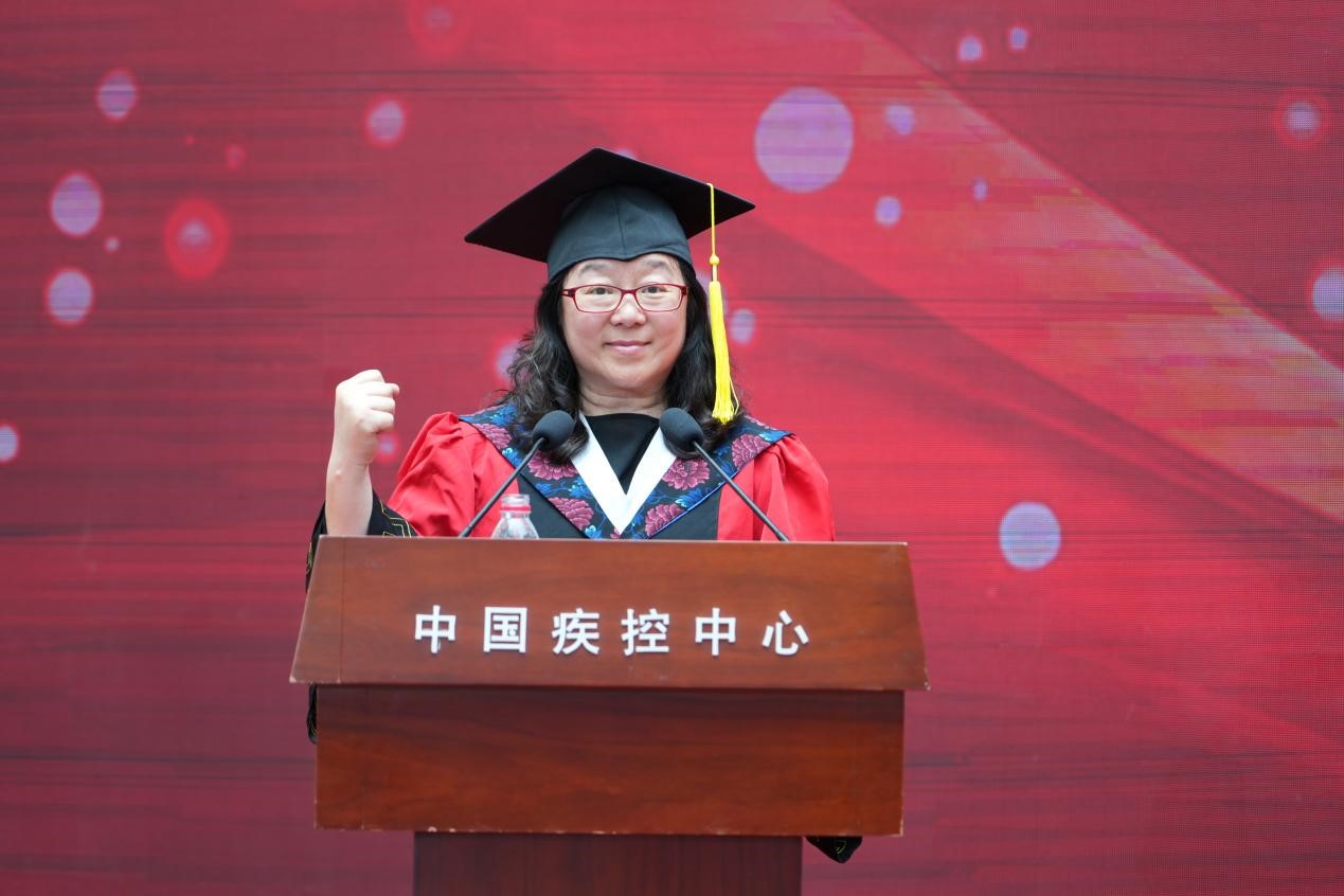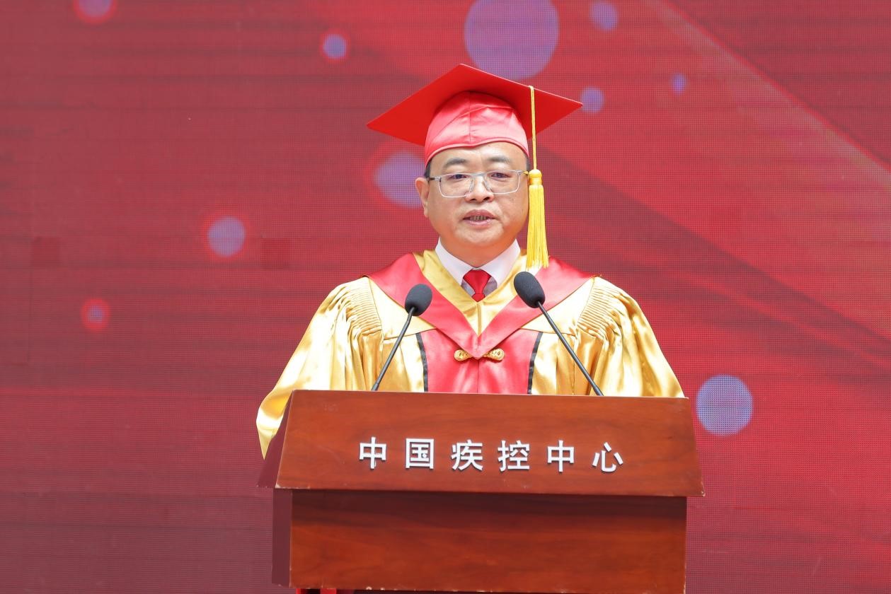 中心(院)主任(院长)、研究生院院长、学位评定委员会主席王健伟以“砥砺家国情怀 勇攀公卫高峰”为题致辞。他表示,同学们求学于疾控改革时代,成长于中国疾控中心,坚守在疾病防控前沿,书写了不平凡的青春篇章。他肯定同学们砥砺奋进,追求卓越,欣喜于同学们的科学素养日益精深,实践能力显著增强,家国情怀愈发深厚,为筑牢健康长城奠定了坚实基础。他寄语同学们要勇攀高峰,以鸿鹄之志做“国之大者”的践行者,以开拓创新做科技自强的破壁者,以实干之力做知行合一的奋斗者。希望大家以“不平凡”的志气、“砺精进”的锐气、“攀高峰”的勇气,在新征程中乘风破浪,再创非凡。